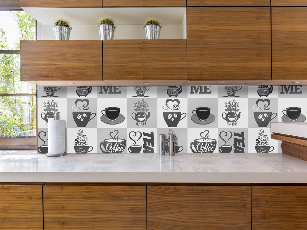 Autocolant faianţă decorativă Coffee Break - creează uşor un nou decor, modern în bucătărie, fără mizerie şi fără deranj in casă. Designul îmbină ceşti de cafea şi ceai în nuanţe de gri. Fiecare pătrat are latura de 22 cm. Pe lăţimea rolei de 67 cm sunt 3 pătrate.