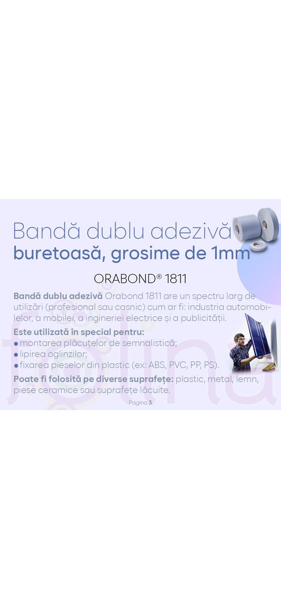 Bandă dublu adezivă buretoasă Orabond 1811, rolă de 100cm x 25m, grosime 1mm Banda dublu adezivă pe suport de burete alb realizată din spumă de polietilenă cu celule închise și grosime de 1100 microni acoperită cu un liner (protecție) din hârtie albastră siliconată pe ambele fețe. Adezivul utilizat asigură o putere de aderență inițială ridicată chiar și pe suprafețele aspre și neuniforme. Adezivul este acrilic modificat pe bază de solvent, permanent pe ambele fețe. Banda dublă adezivă ORABOND® 1811 are un spectru larg de utilizări (profesional sau casnic) cum ar fi: industria automobilelor, a mobilei, a ingineriei electrice și a publicității. Este utilizată în special pentru: montarea plăcuțelor de semnalistică; lipirea oglinzilor; fixarea pieselor din plastic (ex: ABS, PVC, PP, PS). Poate fi folosită pe diverse suprafețe: plastic; metal; lemn; piese ceramice; suprafețe lăcuite.
