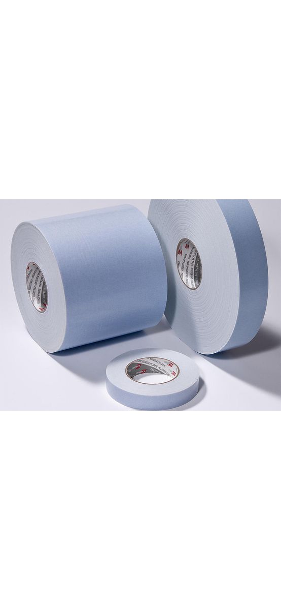 Banda dublu adezivă pe suport de burete alb realizată din spumă de polietilenă cu celule închise și grosime de 1100 microni acoperită cu un liner (protecție) din hârtie albastră siliconată pe ambele fețe.