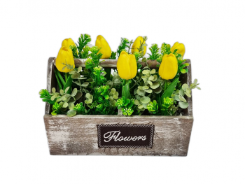 Lalele artificiale galbene, Folina, aranjament în lădiţă din lemn
