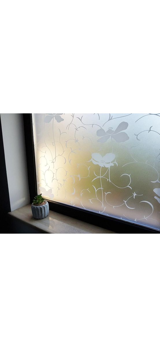 Folia de sablare cu model floral alb Lucia asigură intimitate, dar fiind translucidă permite pătrunderea luminii naturale.