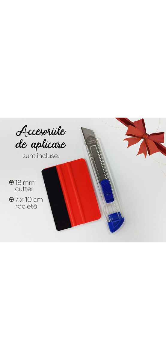 • Racletează - pentru aplicarea autocolantului recomandăm folosirea unei raclete din plastic care o parte cu pâslă, sau o racletă din cauciuc/silicon. Acestea nu zgârie folia.