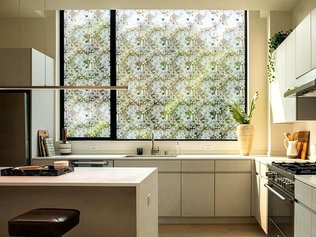 Folie geam autoadezivă Kalea, sablare cu model floral și păsări