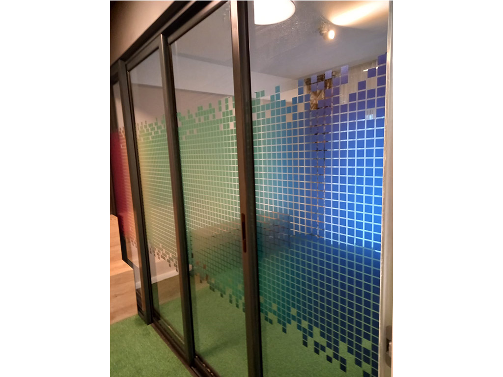 Folia de sablare Spectrum cu model geometric colorat este ideală pentru suprafeţele vitrate din clădirile de birouri. Este disponibilă la rolă cu dimensiuni de 98 cm ( lăţime ) şi 3 metri ( lungime ).