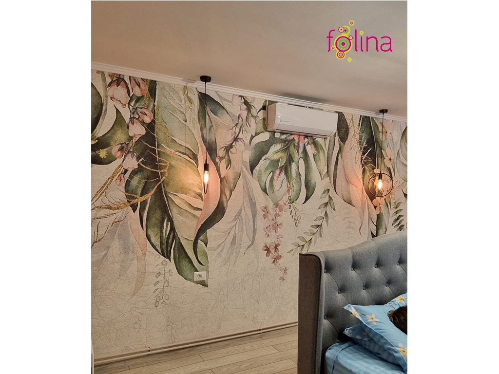 Pe un fundal ce imită o tencuială vintage, cu crăpături, sunt printate frunze şi flori în nuanţe de verde, roz, mov, bej.