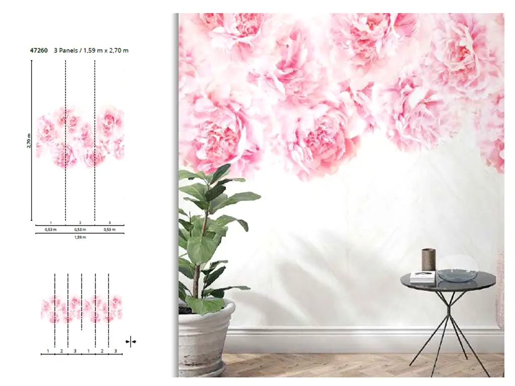Fototapet floral roz, Marburg 47260, pe suport vlies, 159x270 cm Acest model de tapet aduce frumuseţea bujorilor în decorul casei tale. Pe un fundal ce imită un panel din lemn crem, este o bordură formată din bogate flori roz. Rola conţine 3 fâşii (53x270 cm ) care se îmbină pentru a crea o imagine de 159 cm lăţime şi 270 cm înălţime. Pentru a acoperi o suprafaţă mai mare se pot îmbina mai multe role. Tapetul este pe suport vlies. Materialul este lavabil şi are o bună rezistenţă la lumina soarelui.