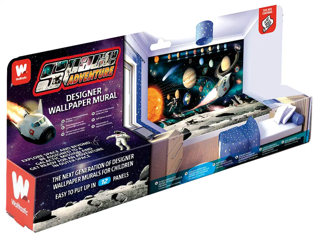 Fototapet planete Space Adventure Fototapetul planete Space Adventure este o decoraţiune pentru perete spectaculoasă pentru camera copiilor sau pentru spaţiile unde se desfăşoară activităţi educative. Cei mici vor învăţa în joacă tainele sistemului solar. Aplicare Fototapet planete Space Adventure, , decorațiune multicoloră Fototapetul se aplică ușor pe perete cu suprafață netedă. Fototapetul este format din 12 părţi care se îmbină şi formează o imagine de 3.05 metri lăţime şi 2.44 metri înălţime.