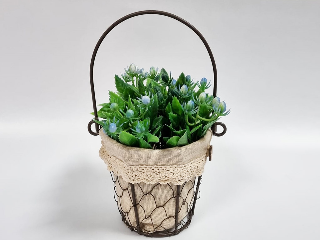 Găletuşă decorativă, Folina, model vintage, cu plante artificiale Găletuşă decorativă din sârmă împletită şi săculeţ textul cu broderie şi nasture. Are un aranjament din plante artificiale verzi cu muguri galbeni Dimensiuni: 22 cm înălţime ( cu toarta ridicată ) şi un diametru de 12 cm.
