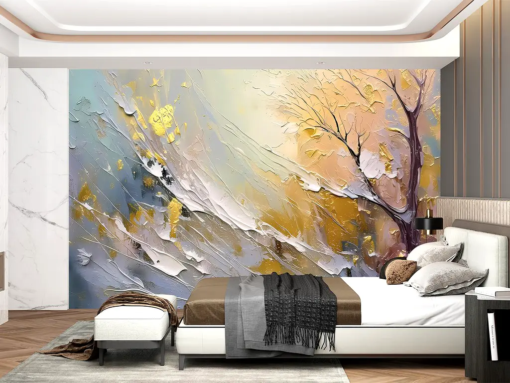 Fototapet abstract imitaţie decorativă, Autumn Whispers, decor perete living, dormitor, 312x219 cm Transformă-ți locuința sau spațiul de lucru într-un loc spectaculos cu ajutorul fototapetului mural de la Wall4Soul. Acest decor de perete de înaltă calitate oferă un plus de creativitate și rafinament în orice încăpere, fie că este vorba despre dormitoare, birouri, camere de zi sau spații publice precum restaurante, hoteluri sau centre de spa. Cu un design captivant și disponibil în diverse dimensiuni, acest fototapet se adaptează perfect oricărui spațiu, aducând un plus de eleganță și stil. Realizat din material textil nețesut semi-lucios, de 130 g/mp, fototapetul este ușor de montat datorită adezivului special inclus în pachet. Procesul de instalare este simplu și rapid, cu ajutorul ghidului de aplicare. Tehnologia de imprimare digitală Full HD garantează culori vibrante și detalii clare, protejate de un strat UV, pentru a rezista în timp. Fie că dorești să creezi o atmosferă relaxantă în dormitor sau un mediu de lucru creativ în birou, acest fototapet aduce o schimbare notabilă. Ideal nu doar pentru locuințe, ci și pentru spații publice precum restaurante, hoteluri, centre spa sau birouri, acest fototapet conferă personalitate și caracter fiecărui spațiu. Este prietenos cu mediul, lipsit de mirosuri și sigur pentru utilizare în camerele copiilor. Recomandări de utilizare: În locuințe: oferă o notă de rafinament și relaxare în dormitoare, camere de zi sau birouri de acasă. În spații publice: ideal pentru restaurante, hoteluri, centre spa și zone destinate copiilor, unde atmosfera prietenoasă și creativă este esențială.