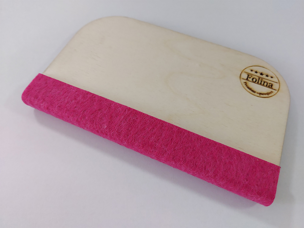 Racletă profesională din lemn cu cap din pâslă, moale, groasă, dimensiune 9x15 cm Racletă din lemn, profesională, lată, ideală pentru aplicarea autocolantului, foliei, tapetului. Racleta are o latura cu pâslă groasă de 2 mm, pe ambele părți. Pâsla este de cea mai bună calitate si nu zgârie materialele. Suprafața mare a racletei facilitează aplicarea rapida a materialului. Este foarte rezistentă in timp, putând fi folosită in multiple aplicări.