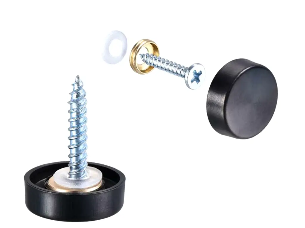Set din 4 șuruburi cu capac cromat, negru, pentru plăci acrilice sau oglinzi, diametru cap 16mm