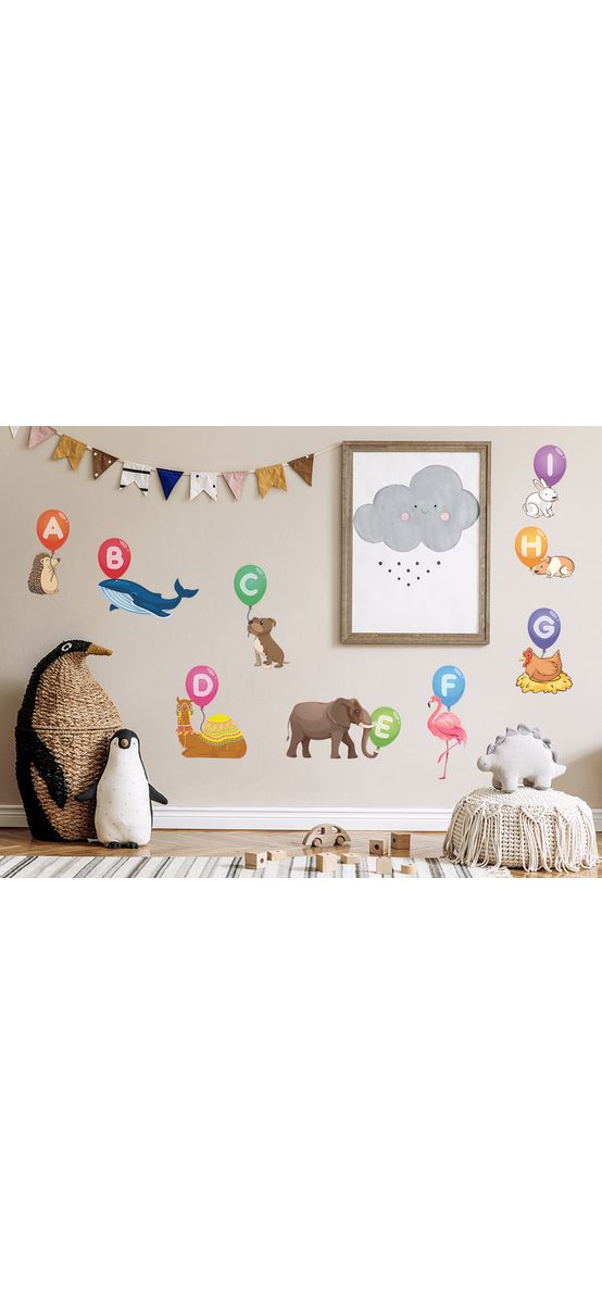 Set stickere alfabet cu animale, Folina, planșă mare de 145 cm, racletă de aplicare inclusă O decoraţiune colorată şi practică în acelaşi timp pentru grădiniţe, afterschool. Setul acoperă o suprafaţă totală de aproximativ 145 x 100 cm. Dimensiunea individuală medie a stickerelor este de 25 x 15 cm, unele fiind mai mici sau mai mari. Pot fi aplicate pe perete sau alt suport cu suprafata neteda.