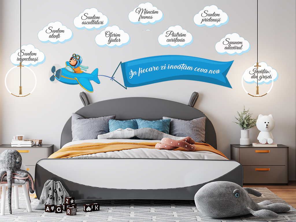 Elementele se aplică individual şi se pot crea diferite decoruri. Dimensiunea aproximativa a avionului este de 145 x 30 cm iar cea a norilor este de 28 x 18 cm